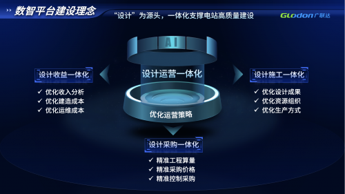 作为中国数字工程领域近三十年深耕者,广联达带着“数字技术”、“工程建设基因”及“AI能力”,赋能新能源赛道,打造面向新能源电站设计、建造、运维一体化的数智平台。广联达的数智平台建设,以“设计”为源头,一体化支撑高质量建设为指导思想,通过AI对传统数字化技术加持,实现四个一体化,支撑电站高质量建设和高收益的目标。