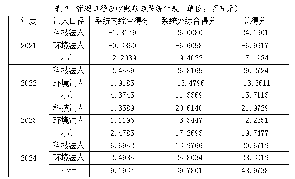 从年度综合得分看,24年虽然整体余额同比压降率较低,但整体得分最高。其得分较高的原因,主要是五年以上余额同比压降得分高,系统内得分5.9092、系统外得分42.6009,远高出其他年度得分。从工作导向上看,应收账款余额压降的最关键就是长账龄应收账款的攻坚。由此可见,评价结果与目标诉求,存在一定趋同性。通过得分统计结果也可以发现到24年工作存在的问题,即三年以内系统外应收账款余额同比压降力度不足,特别是科技法人口径。溯源分析科技法人24年系统外应收账款绝对数字,由23年10.72万元变化到57.76万元,数据相对增长大,但整体影响有限,后续加以注意跟踪即可。