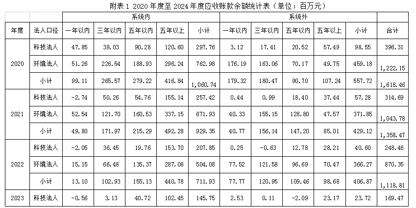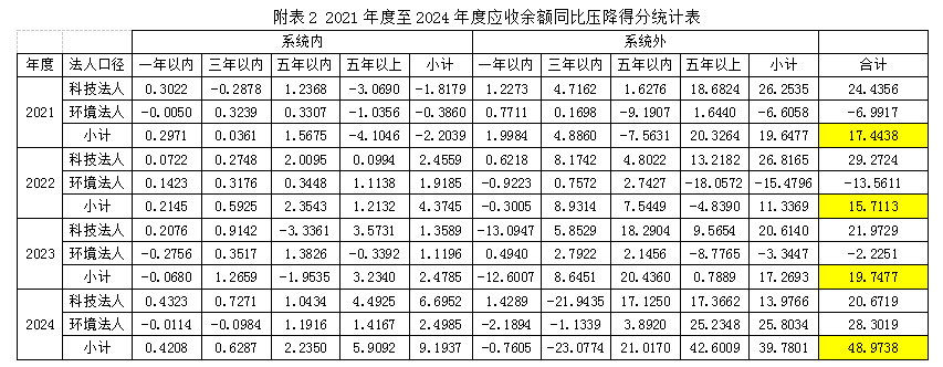按表中数据所示,四年来累计应收余额共压降93553.70万元,较期初余额相比下降57.50%。同比来看,自21年起,每年应收账款余额压降率分别为16.06%、17.64%、26.93%、16.46%。从总量维度衡量,23年整体压降金额最高、同比降低幅度最大,为最佳年度;从科技法人单体维度衡量,24年同比压降率38.47%,工作效果最为显著;从环境法人单体维度考虑,23年同比压降25.54%,为历年最佳;从系统内应收应收压降角度,24年同比压降23.91%;从系统外统计数据考虑,23年同比压降37.98%,效果最佳。