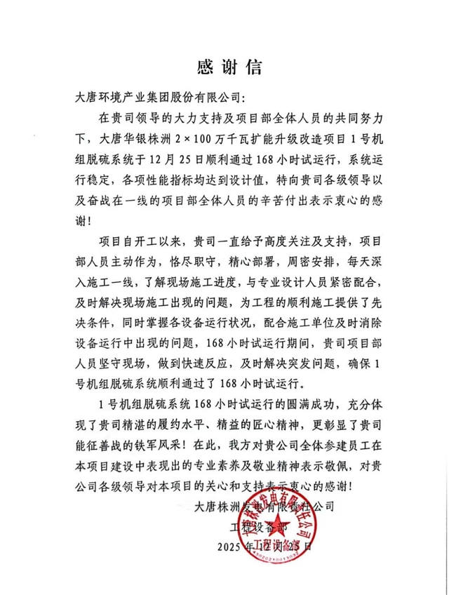12月25日,由大唐环境环保分公司承建的大唐华银株洲脱硫EP项目1号机组顺利随主机同步通过168小时试运行。试运行期间,脱硫系统运行稳定,各项性能指标优良,业主致信予以感谢。